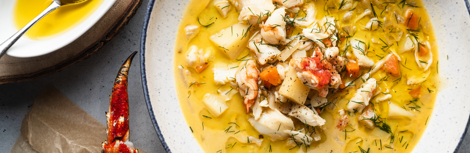 This Nordic seafood chowder is all the right things—warm, cozy, and full of flavor from a homemade seafood stock. While there are many variations of Nordic chowder, most folks use egg yolks and heavy cream to thicken the stew. Here, we combine creamy skyr, egg yolks, and heavy cream. The result is rich, but not too heavy, and balances well with the sweet-salty flavor of Alaskan King Crab.