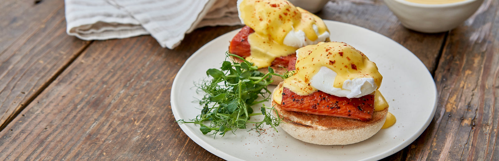 - Place the toasted english muffin halves on a serving plate and top each half with the Smoked Coho Salmon.